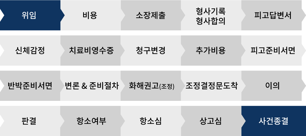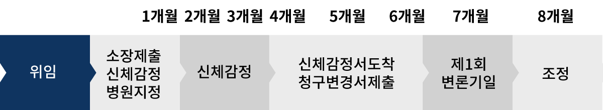 위 진행사항은 일반적인 경우이며, 형사기록의 도착, 신체감정서의 도착, 기타 증거자료의 입수가 늦어지는 경우에는 위 기간보다 지연될 수 있습니다.