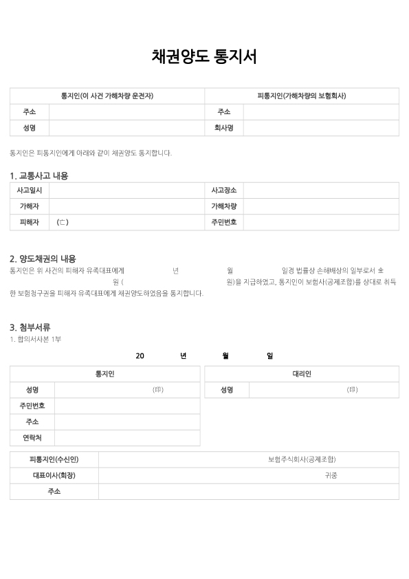 채권양도 통지서는 가해자가 우체국에 가서 내용증명으로 보낸 다음 피해자(유족) 측에 그 사본을 전달해줘야 마땅하나 합의 후 다시 만나는 것이 쉽지 않고 번거롭기에 가해자 측의 동의를 얻어 가해자 명의로 피해자 측에서 우체국에 방문하여 내용증명으로 보내는 것이 편리할 것입니다.
