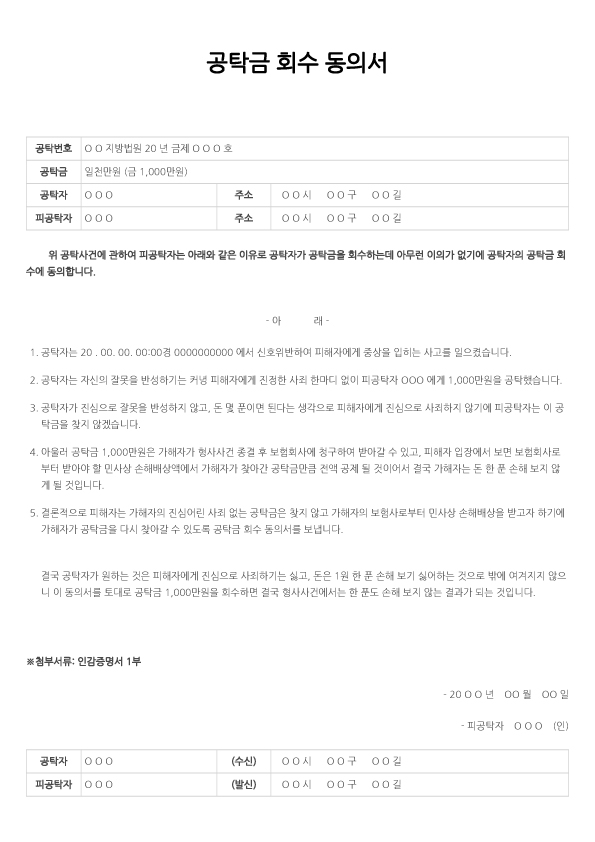 공탁금을 회수하기 위하여 이에 대하여 신청을 하게 되며, 상대방은 이에 대해 동의하여야 하는데, 이때 작성하는 것을 말한다.